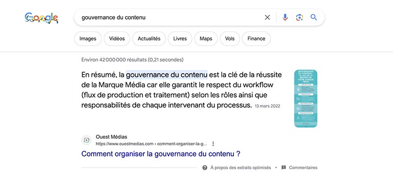Puis après analyse, l’optimisation du référencement naturel a pour but principal d’améliorer le classement organique de cette page en la faisant remonter au plus haut, en tant que lien bleu ou extrait (position zéro) optimisé, au-dessus du résultat n°1 dans un encadré 100% visible. A l’instar de la recherche « gouvernance du contenu » dont le rich snippet est détenu par Ouest Médias. Nous le verrons plus avant dans cet article, l’apport des données structurées en JSON-LD selon schema.org joue un rôle majeur dans ces mécanismes aux confins des algorithmes.